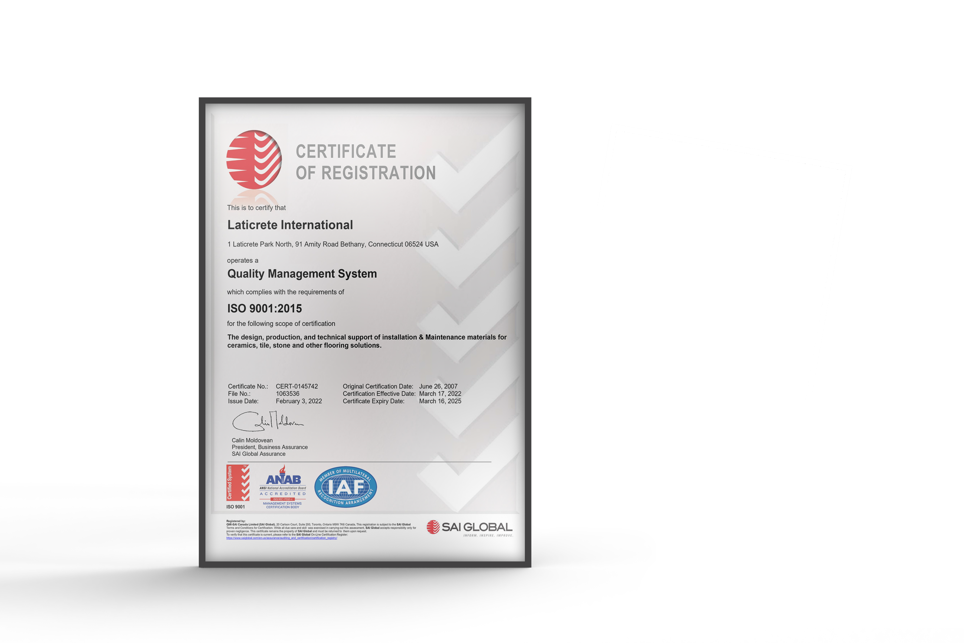 Desde nuestra fundación, LATICRETE ha asumido un compromiso con la calidad para los productos, los clientes y los empleadores. Operamos un sistema de gestión de calidad que cumple con los requisitos de la norma ISO 9001:2015 para el diseño, la producción y el soporte técnico de nuestros materiales de instalación.