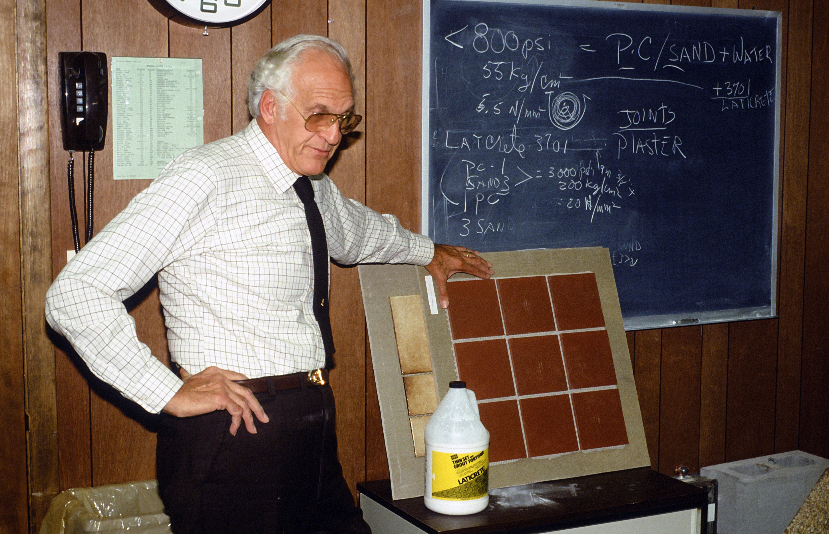 Dr. Rothberg began development work with Uniroyal Chemical at their Naugatuck, CT research facility where he investigated synthetic latex technologies that had been applied to the concrete industry. After much effort and time – LATICRETE® 4237 Latex Thin-Set Additive was developed and taken to market. For the first time a strong, weather and shock-resistant “thin-bed” mortar could be mixed on-site using equal parts of sand and cement, gauged to a workable consistency with LATICRETE 4237. In 1956, not realizing the potential of what would soon prove to be a revolutionary product; Uniroyal sold the LATICRETE brand to Dr. Rothberg, and LATICRETE International, Inc. was born.
